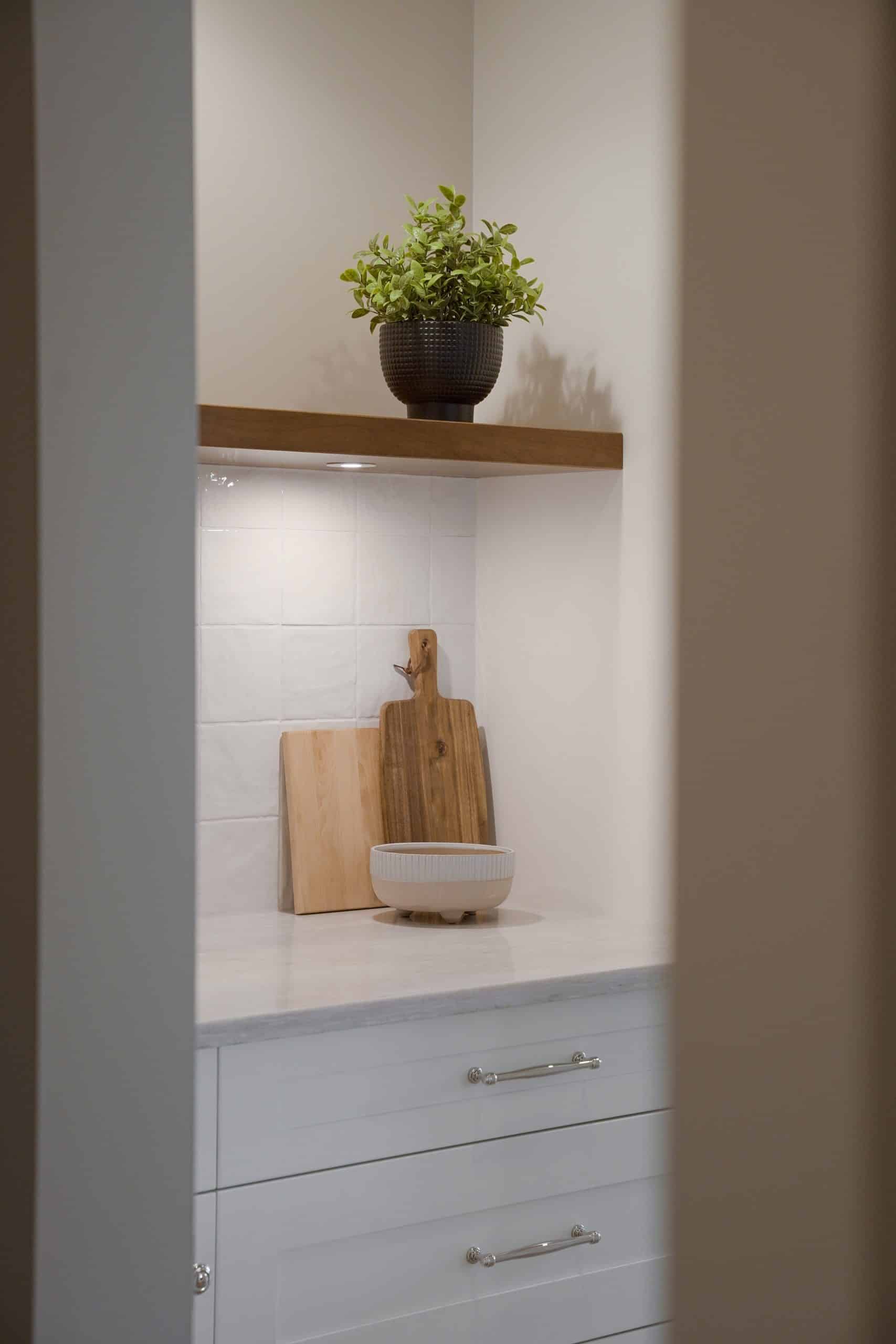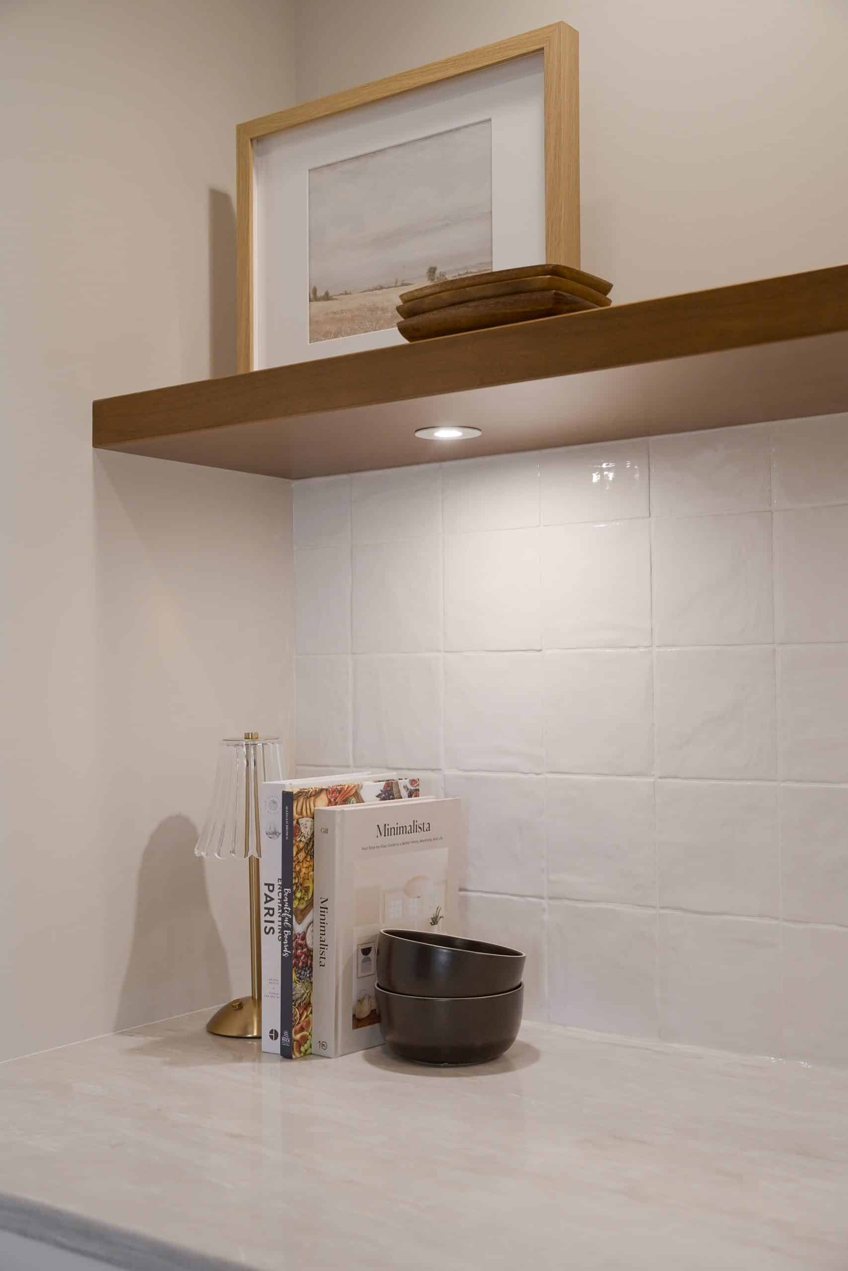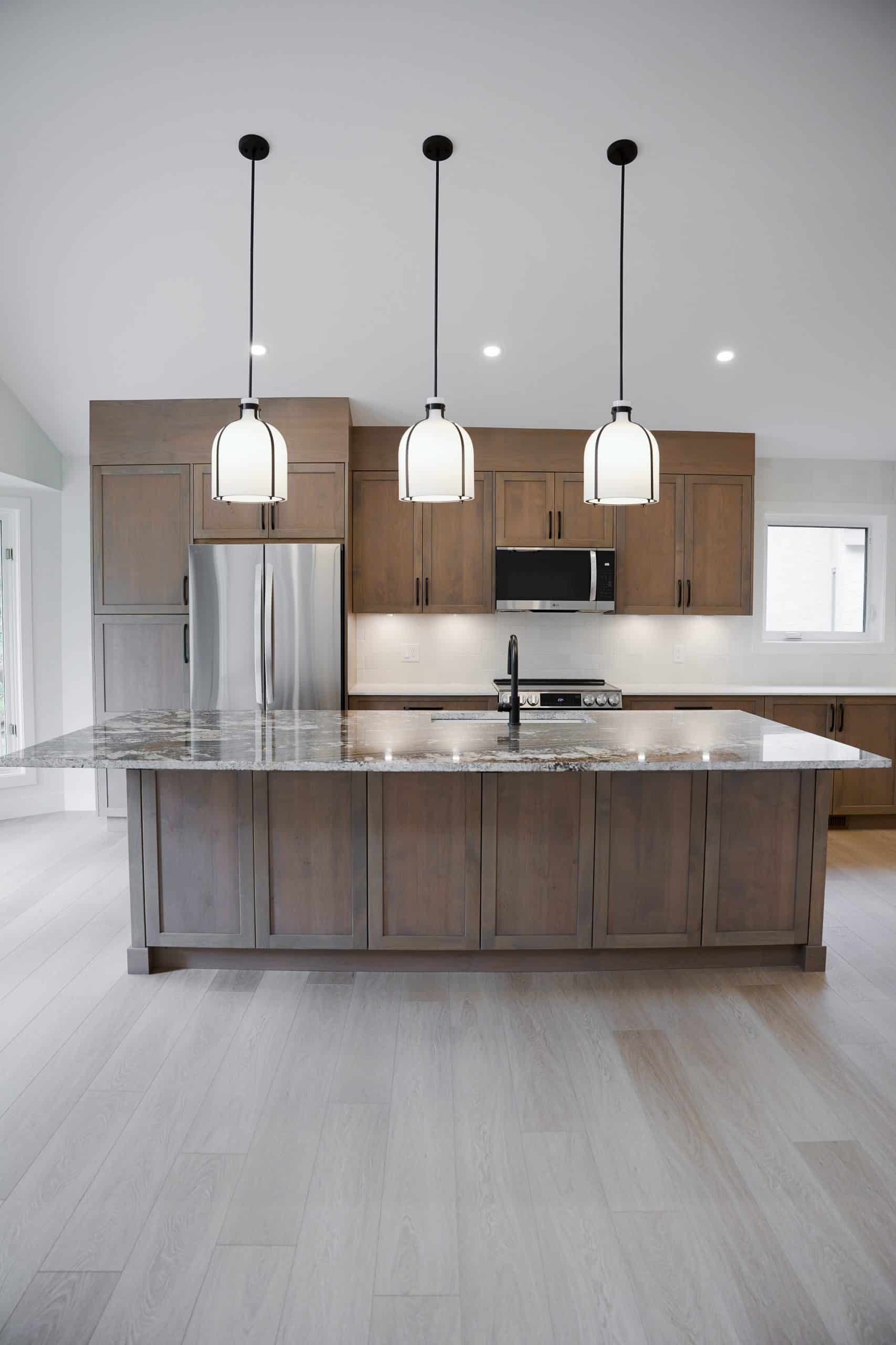 • Lighting is not an afterthought – it’s an integral part of our design process. Statement pendant lights, under cabinet lighting, and recessed potlights work together to create layers of illumination. The result is a kitchen that feels bright and functional during the day and warm and atmospheric in the evening.