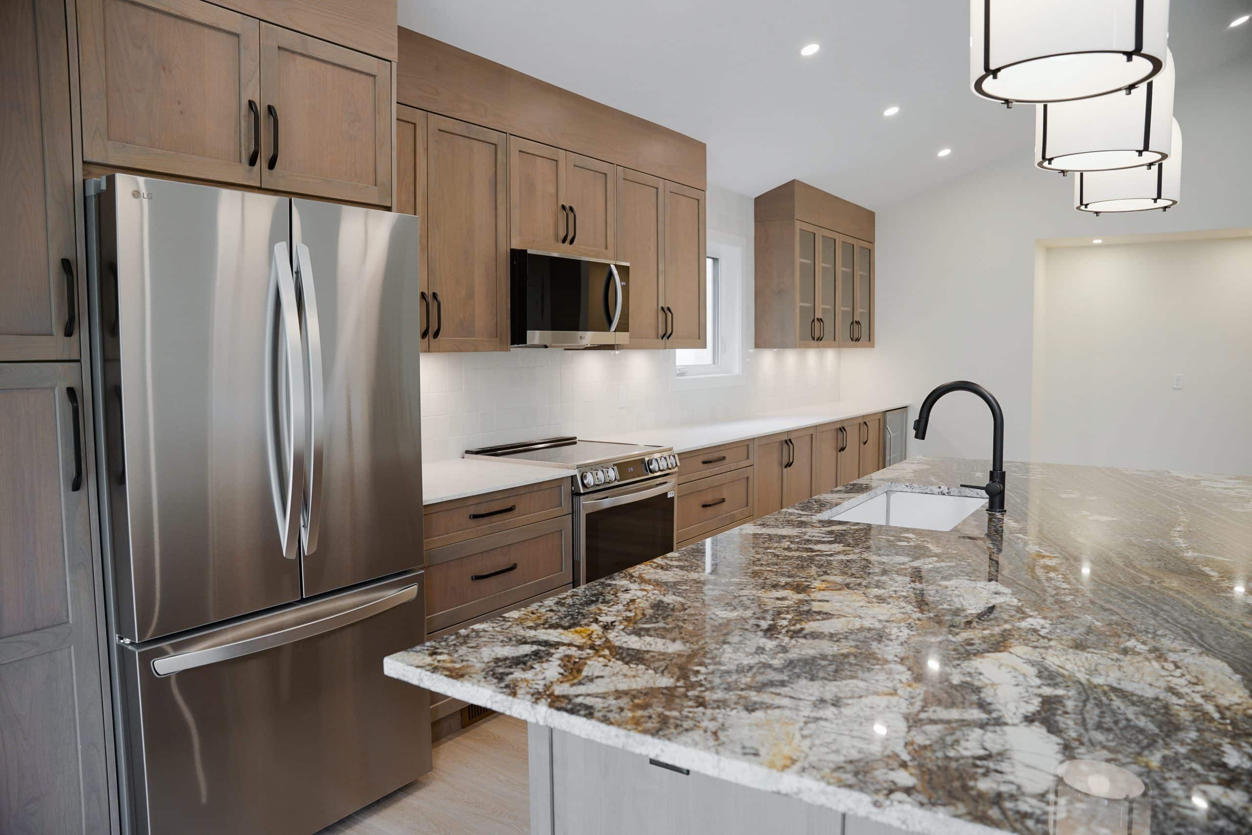 A jaw-dropping granite countertop was selected for the oversized island, adding both visual impact and exceptional durability. The island anchors the space with its bold veining and natural character, and it doubles as a multi-functional hub – ideal for prepping meals, sharing coffee with friends, or hosting casual dinners. For the perimeter counters, quartz was chosen for its durability, clean aesthetic, and low maintenance, offering a subtle contrast that adds depth and dimension to the overall design.